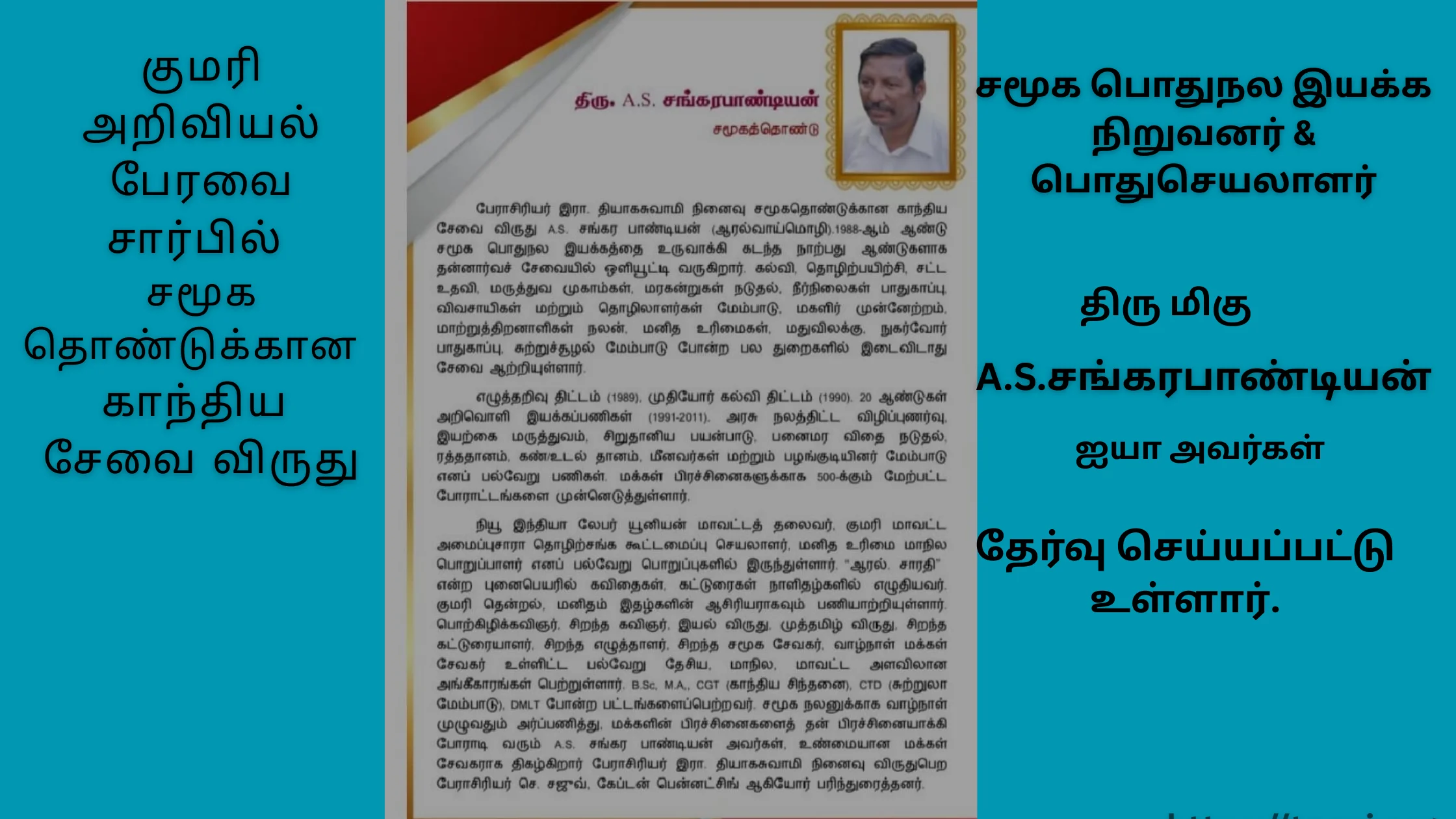 வாழ்த்துக்கள்..!!! குமரி அறிவியல் பேரவை சார்பில் சமூக தொண்டுக்கான காந்திய சேவை விருதுக்கென சமூக பொதுநல இயக்க நிறுவனர் & பொதுசெயலாளர் A.S.சங்கரபாண்டியன் தேர்வு செய்யப்பட்டு உள்ளார்.…