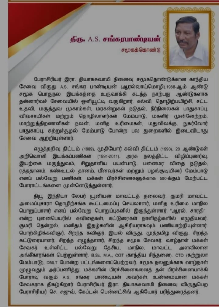 குமரி அறிவியல் பேரவையின் சார்பில் காந்திய சேவை விருது – வாழ்த்துக்கள் A.S. சங்கரபாண்டியன்!