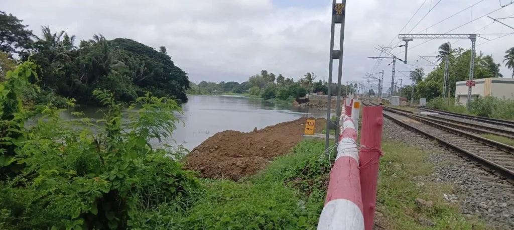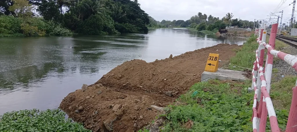 இந்நிலையில் ரயில் வழித்தடத்திற்கு என நாகர்கோவில் ஒழுகினசேரி பகுதியில் ரயில் வழித்தடத்தை ஒட்டி செல்லும் பழையாற்றில் பாலம் அமைக்கப்படுவதாக தெரிகிறது. இதற்கான பணிகள் நடந்து வருகிறது. நீர்பிடிப்பு இல்லாத பகுதிகளில் மண்ணை நிரப்பி பில்லர் அமைப்பர்.நீர்நிலைகளில் பணி நடைபெறும் போது அப்பகுதிகளில் ஆழ்துளை கிணறுகள் அமைத்து அதில் பாலம் அமைப்பர். ஆனால் அதிக அளவில் நீர் ஓட்டம் கொண்ட பழையாற்றில் மண்ணால் மூடி வருகின்றனர்.