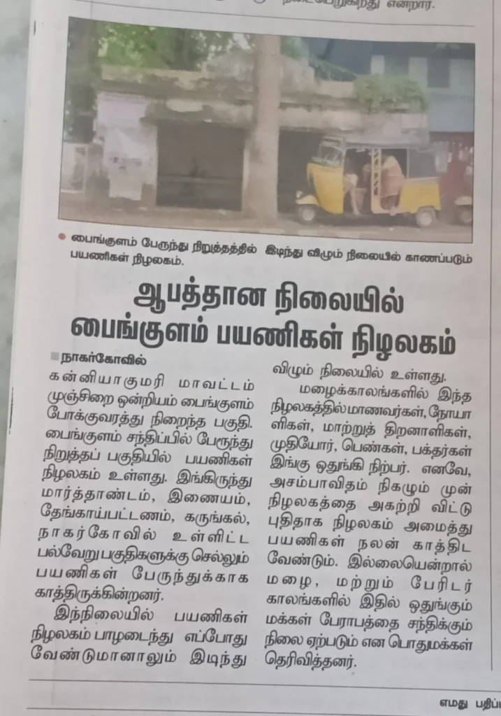 குமரி மாவட்டம் முஞ்சிறை ஒன்றியம் பைங்குளம் ஊராட்சி பகுதியில் பிரதான சந்திப்பில் பஸ் நிறுத்தம் பகுதியில் உள்ளது பயணிகள் நிழலகம். இப்பகுதியில் இருந்தே மார்த்தாண்டம், இணையம், தேவ்காப்பட்டணம், கருங்கல்,நாகர்கோவில் உள்ளிட்ட பல்வேறு பகுதிகளுக்கு செல்லும் பயணிகள் பேருந்திற்காக காத்திருக்கின்றனர்.