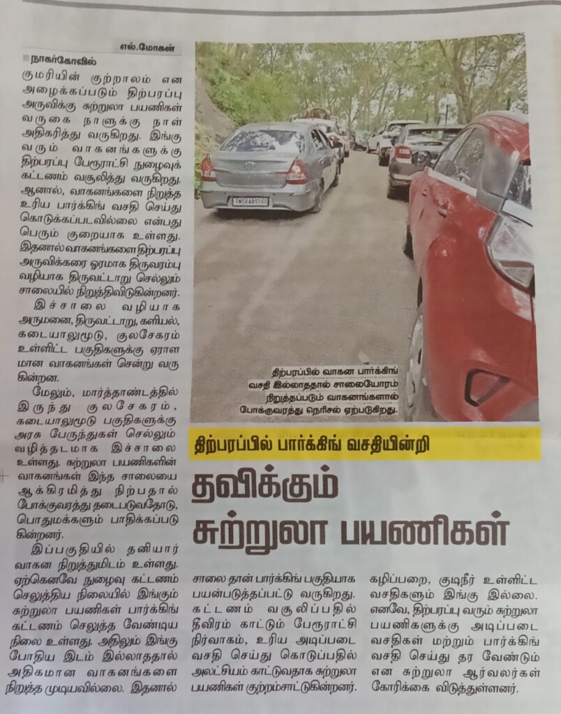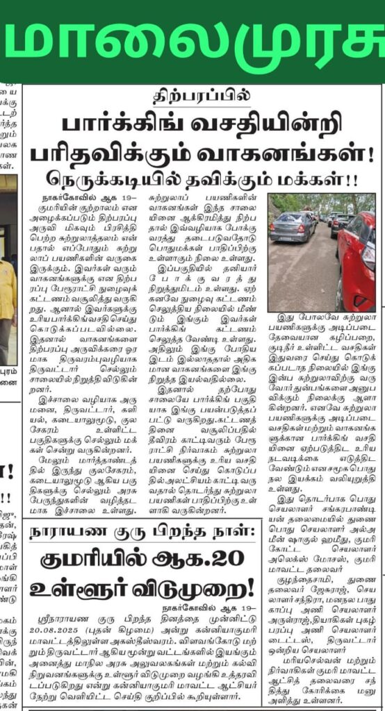 Media திற்பரப்பில் பார்க்கிங் வசதியின்றி பரிதவிக்கும் வாகனங்கள். சமூக பொதுநல இயக்கம் Aug 15, 2025 0 நன்றி-மாலைமுரசு நன்றி- இந்து தமிழ் Fashion
